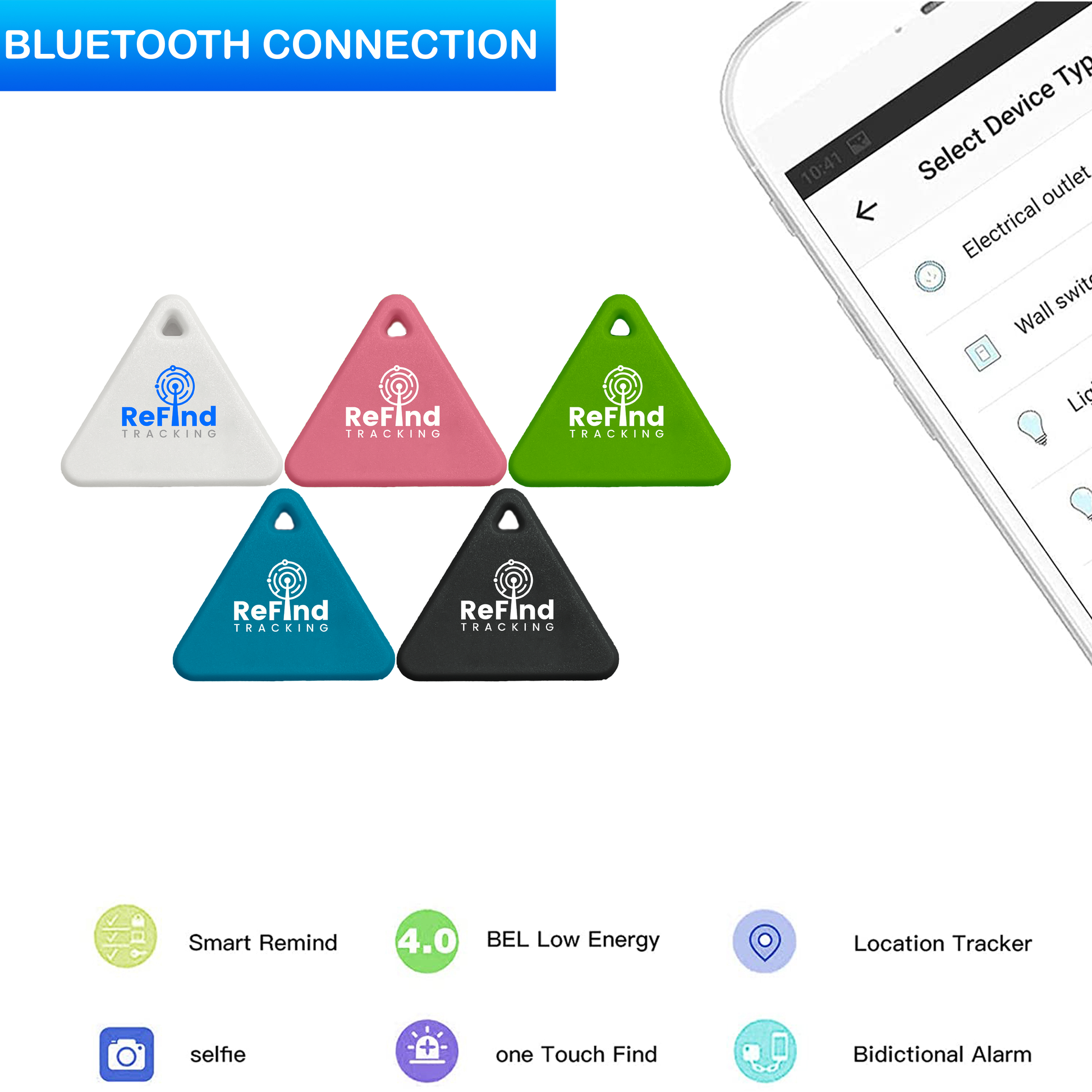 Disconnection alarm: When enabled, alarm sounds on both tracker and smartphone when connection is lost. Alarm on demand: User can sound alarm from tracker to find connected smartphone device & vice versa. Smart tag can also be used to take selfie on smartphone