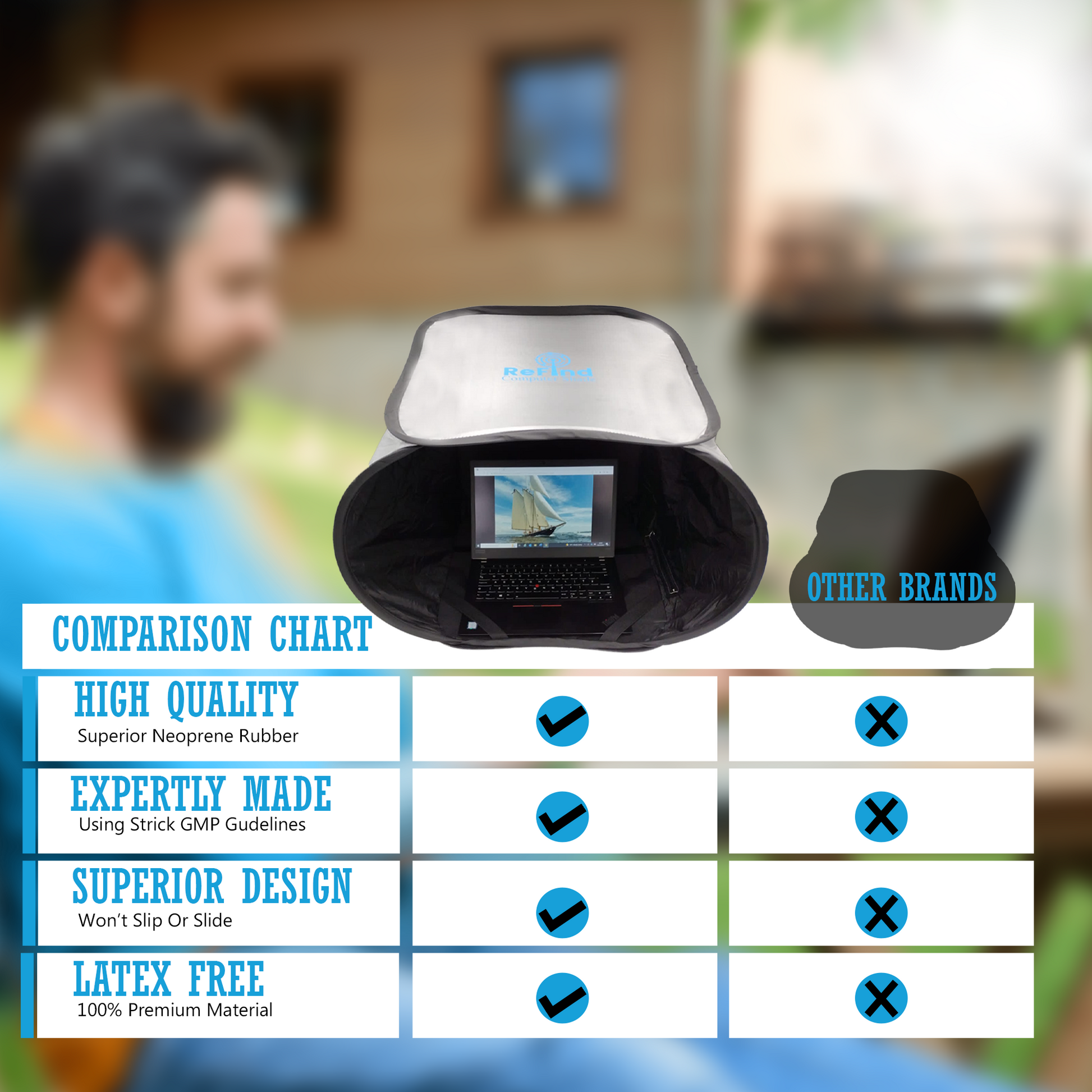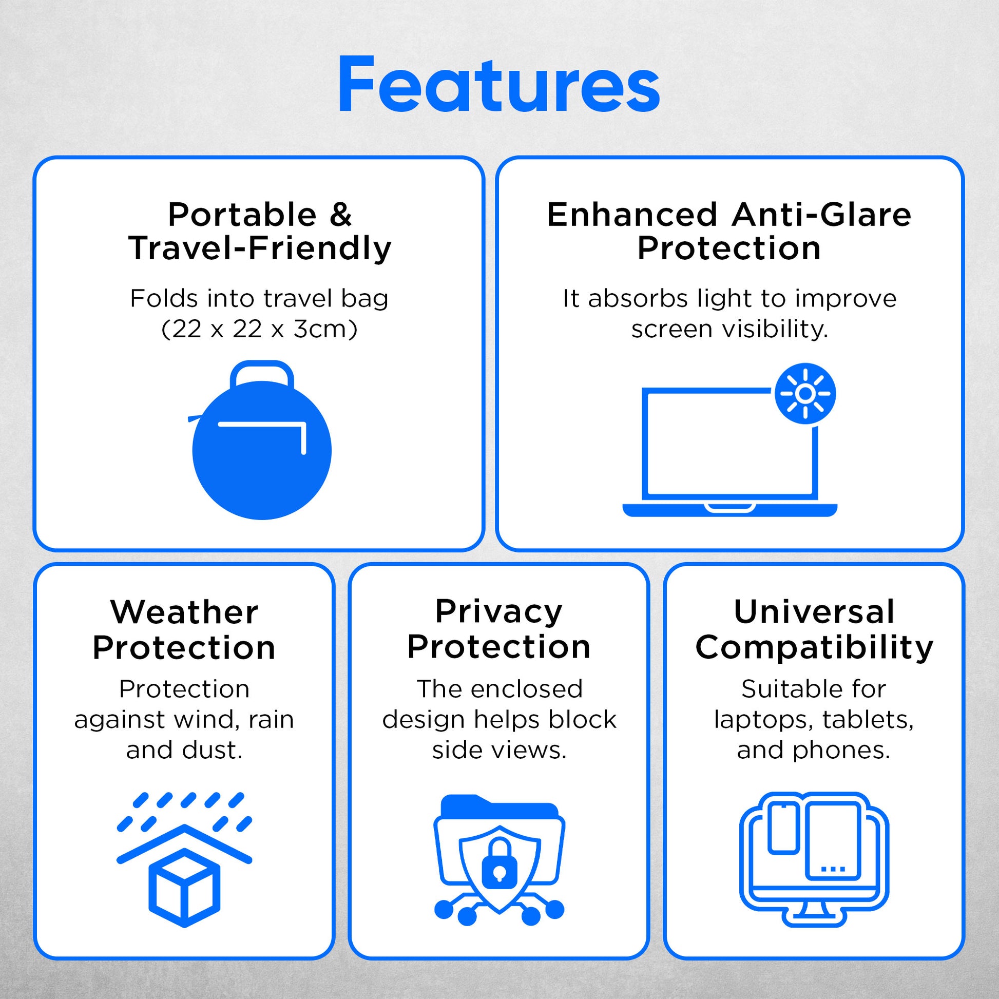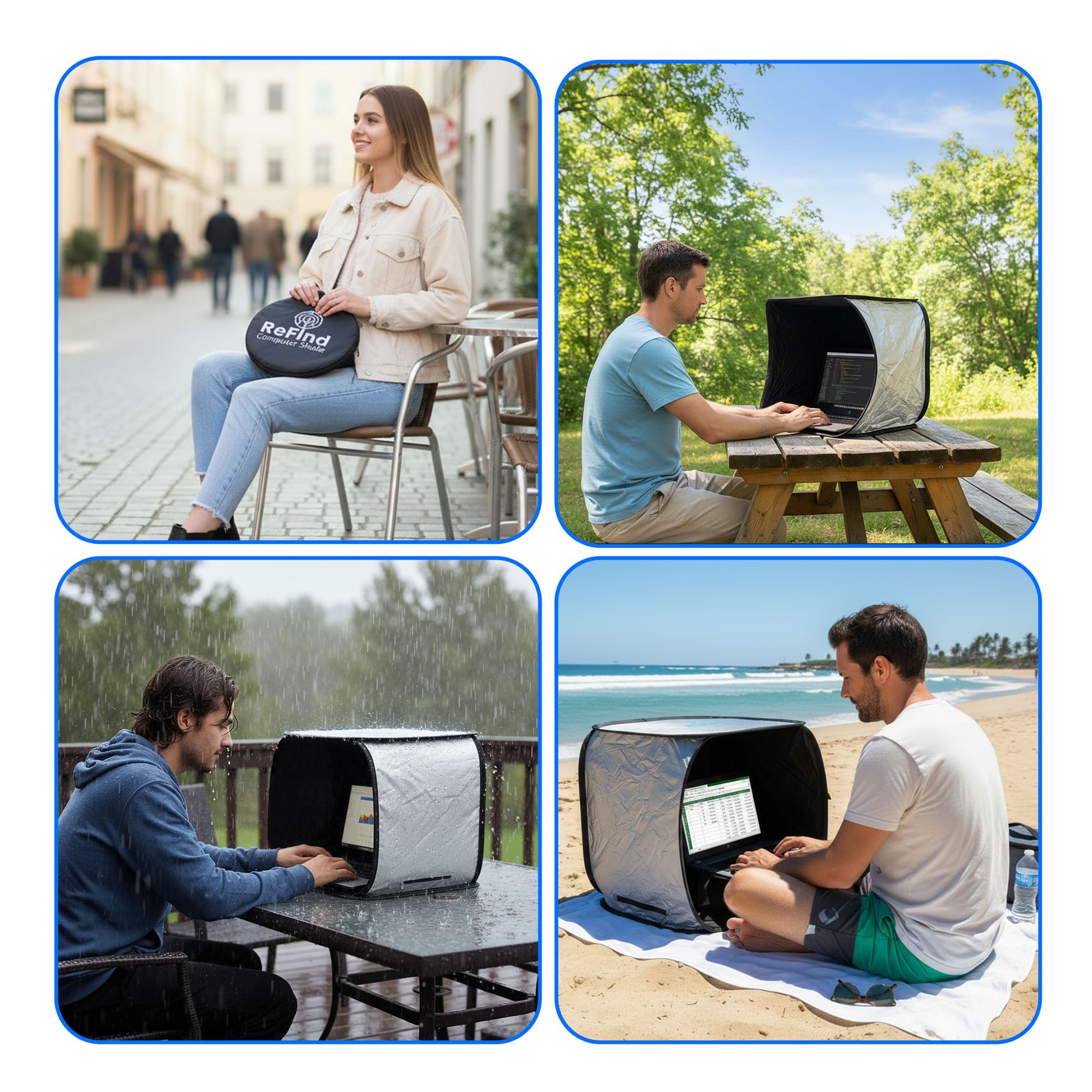The ReFind computer shade is the perfect solution for working outdoors. Stop screen glare and reflections with our anti-glare screen protector sun shade. Its foldable tent like construction makes the device easily portable. Working outside has never been easier. The silver outer layer reflects the light ensuring heat is not absorbed, keeping your laptop cool. This makes the ReFind computer shade compatible for iPhone, Smartphone, Laptop, Computer, Monitor, Tablet and other tech gadgets. This is one of the must have laptop accessories, gaming laptop accessories, camping accessories, phone accessories. The sun shade hood acts as a privacy screen for laptops, keeping the devices screen private away from prying eyes. This laptop shade for working outside has a light construction with strong structural support due to its high quality manufacture. Say goodbye to laptop sun glare with our anti-glare screen protector and laptop stand. Use your laptop screen outside using our electronics sun shade. Its the ultimate laptop screen sun blocker and laptop shade cover for working outside. Our laptop sun hood and laptop sun shade UK is a must in computer accessories.