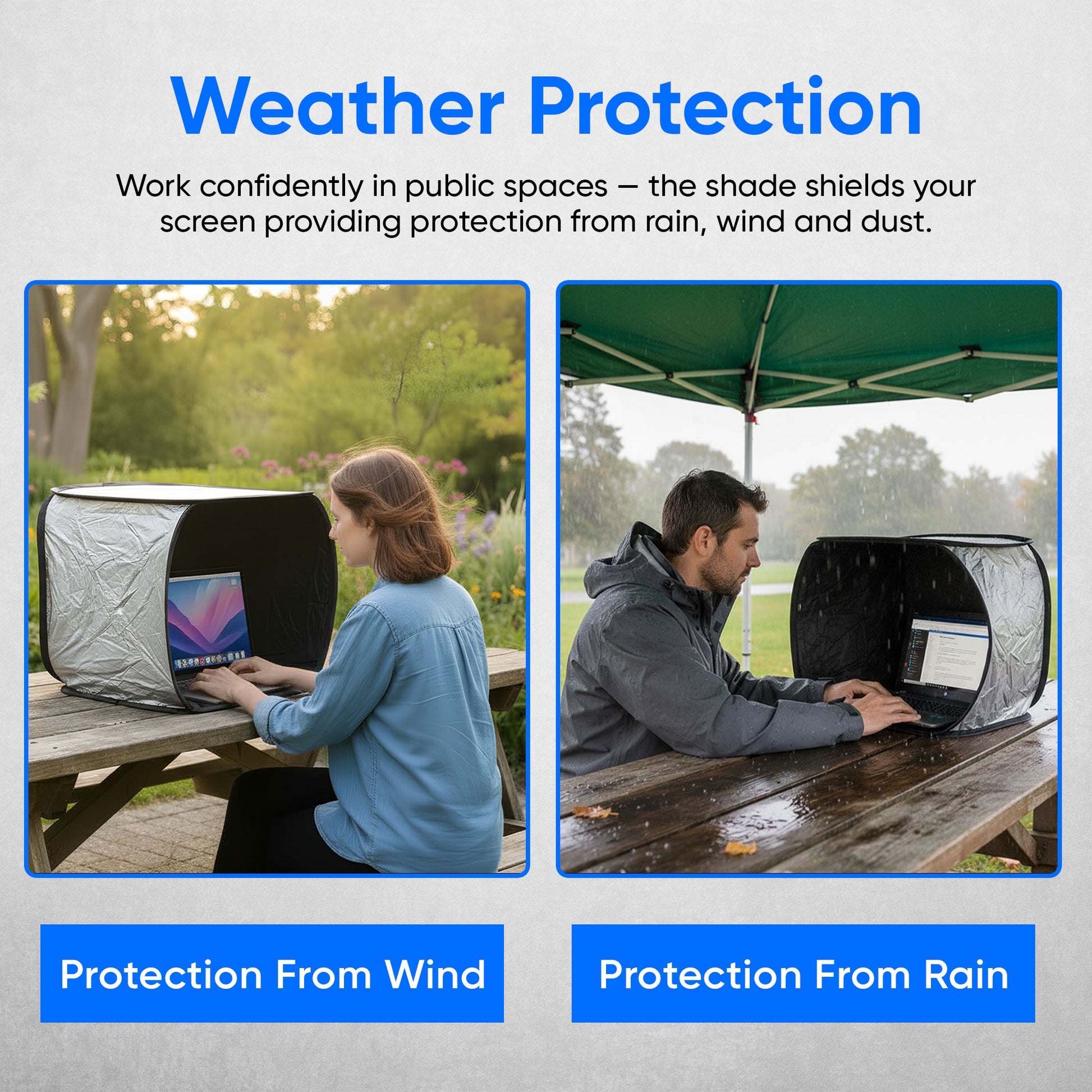 The laptop screen sun shade works as a privacy screen protector away from prying eyes. The computer shade also works as a laptop umbrella, providing rain shelter, water damage and wind damage protection.