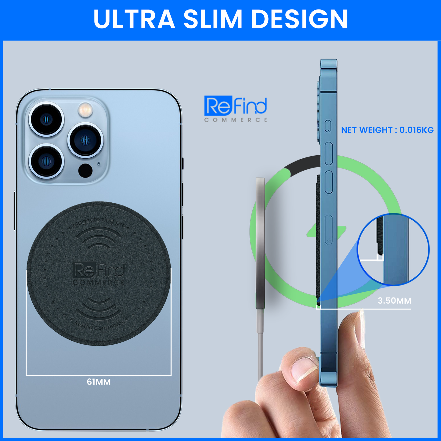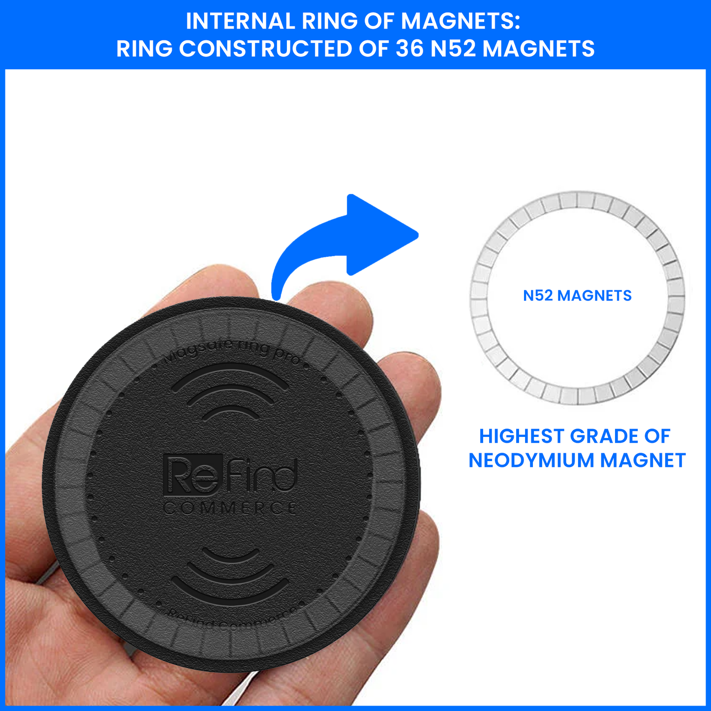 Introducing the ReFind Mag-Safe Pro Ring, the ultimate solution for anyone who wants a stronger MagSafe connection, improved hand grip, and an overall MagSafe capability upgrade. Made for wireless charger iPhone and Android, magsafe wallets, and magsafe battery packs, this product is a must-have for anyone who wants to get the most out of their MagSafe-enabled device.